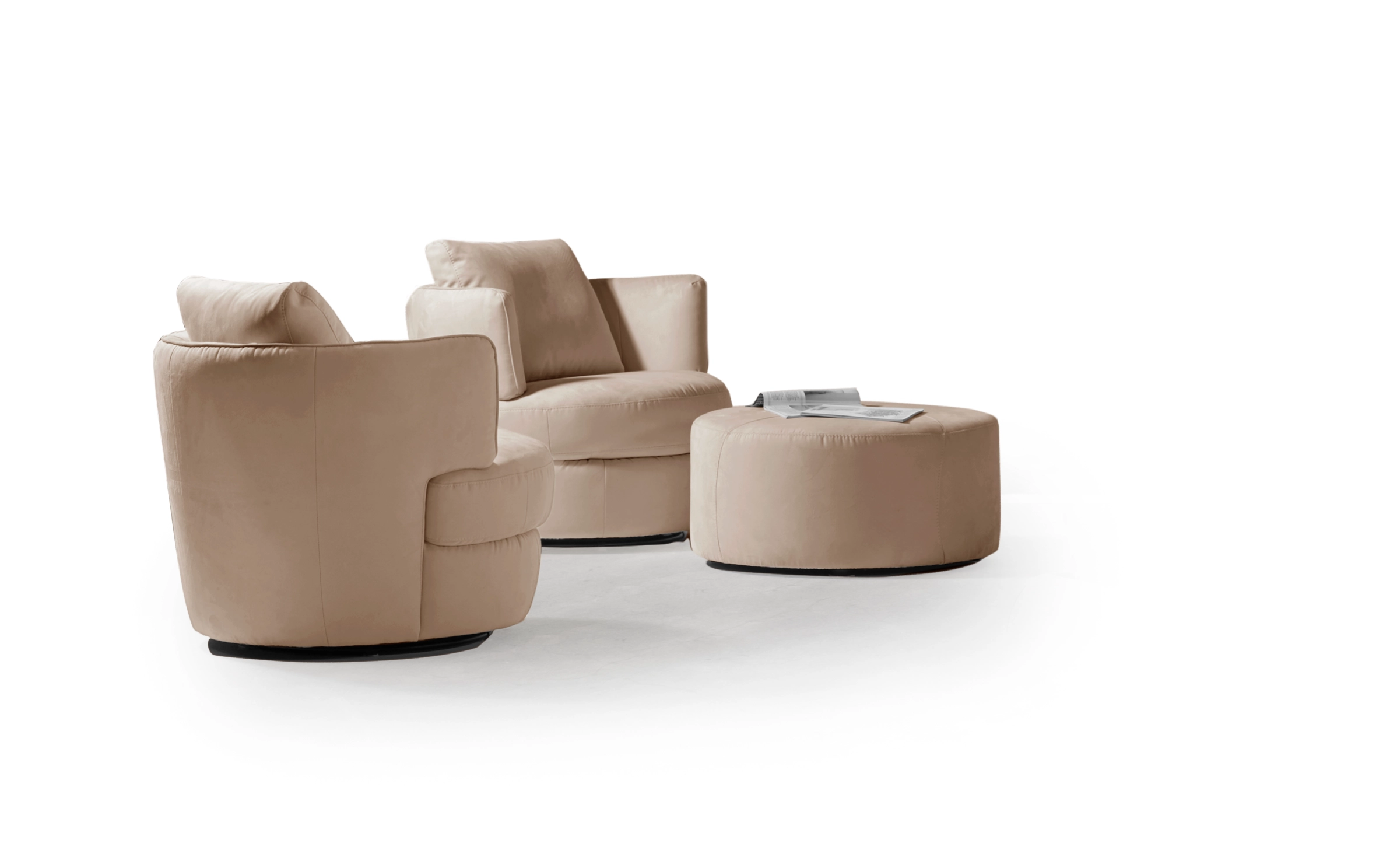 Disponibile in pelle e oltre 300 varianti di colore di tessuto idrorepellente, la poltroncina è realizzabile in versione fissa, girevole, o con l’aggiunta di pouf complementare a forma di mezza luna, che abbraccia la seduta.